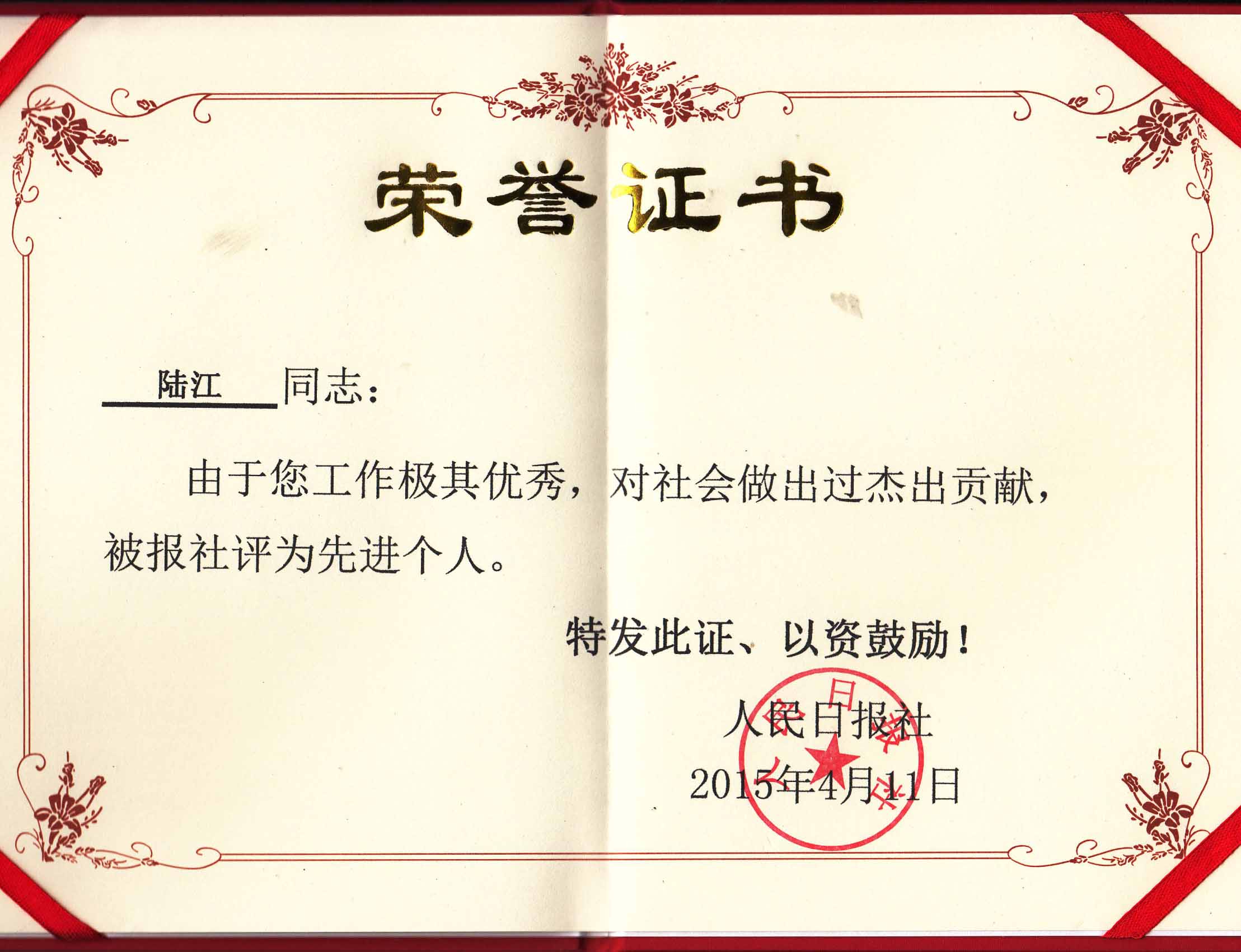 陸江獲得中國醫學??茖2炐銓<沂褎e貢獻獎